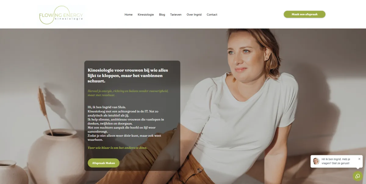 Ingrid is kinesioloog én IT’er. Ze combineert technische denkkracht met diepe, lichaamsgerichte coaching. Maar haar oude Wix-site? Die werkte tegen haar in. Het zag er leuk uit, maar leverde niets op. Zelfs met haar technische achtergrond kreeg ze het niet lekker werkend.