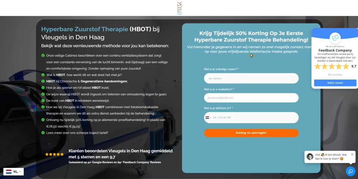 Mondi is eigenaar van Vleugelsdenhaag.nl, een centrum voor gezondheid, ontspanning en geavanceerde therapieën. Wat begon als een praktijk met veel losse onderdelen – van HBOT tot cryo – transformeerde, samen met ons, tot een slimme, geoliede online machine. De uitdaging? Mondi had geweldige diensten in huis, maar zijn website en marketing boden geen structuur, geen slimme opvolging en nauwelijks schaalbare leadgeneratie.